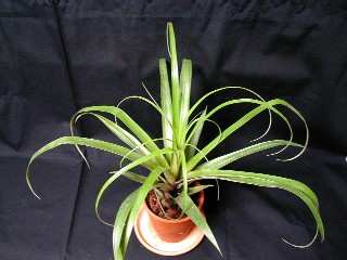 葉巾が狭く、葉の硬いタイプのグループもいます。葉に沿って縦筋が入っているのが 特徴です。また、これらのタイプの花序はコブラの頭のような平たい形状をしています。